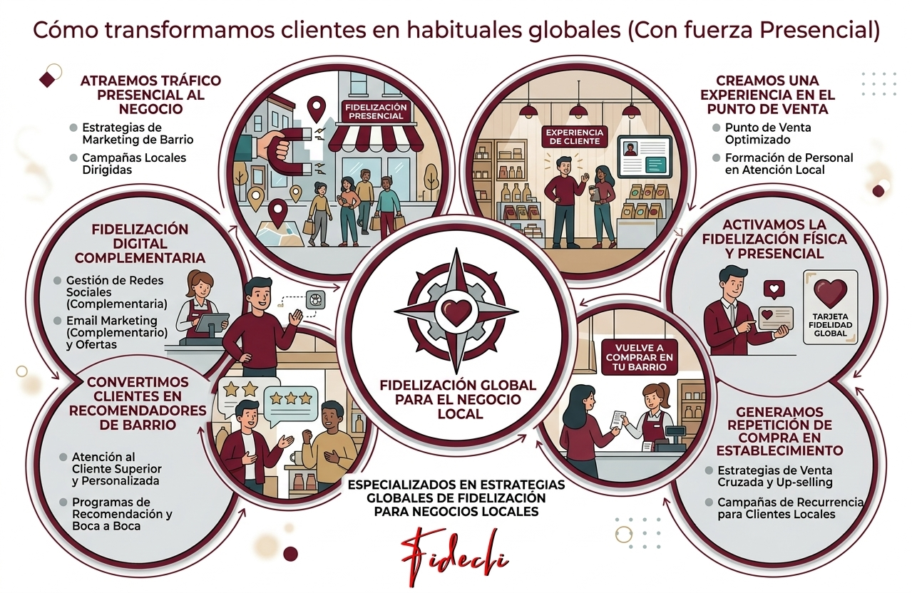 Fidecli es una empresa especializada en fidelización de clientes que ayuda a comercios, restaurantes, centros comerciales, mercados y otros ecosistemas comerciales a aumentar ventas, frecuencia de compra y la relación con sus clientes mediante estrategias de fidelización diseñadas a medida y fáciles de implementar.
